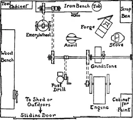 Machinery equipment. Where power ia desired, a 3- or 4-horeepower gasoline eng;ne wiU be needed, unless electricity is avatfabie. In addition, an emery whee^ grindstone, post drill-press, main shafting, pulleys, hangers and belting will complete the equipment. In figuring sizes of pulleys, it will first be necessary to know the number of revolutions per minute the engine runs normally, then to find at what speed the various other toote should run and belt them up accordingly.