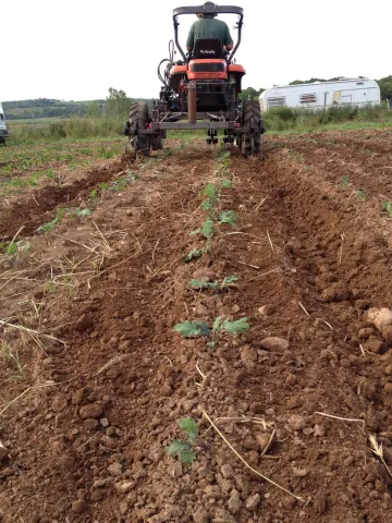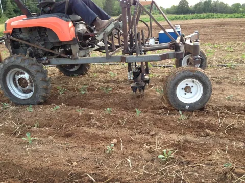 There is no cultivation tractor commercially available that is affordable to purchase and maintain, capable of hyper-accurate weed control, and is able to track straight on sloped ground. Many cultivation systems are used behind a full-sized utility tractor,such as the Williams Tool system and the Regi weeder, causing serious soil compaction and a lot of space lost to wide wheel tracks. In the case of the Regi weeder or other two person tools, labor costs are also doubled.